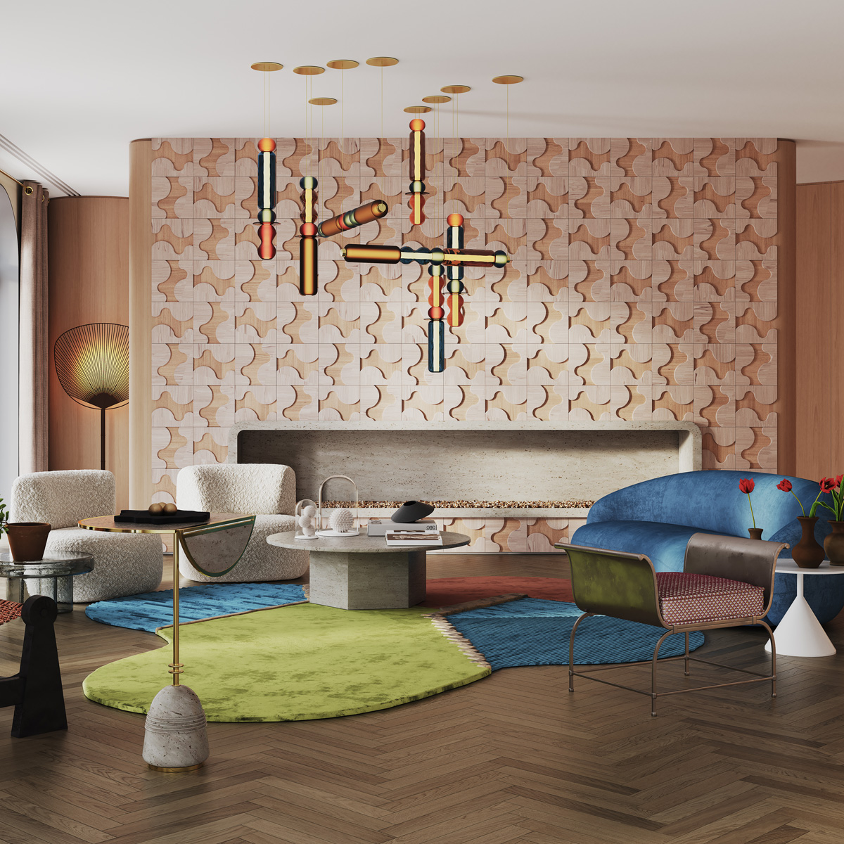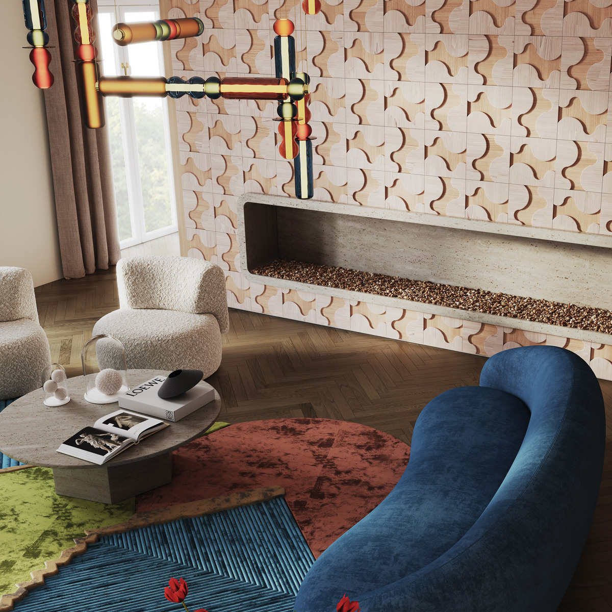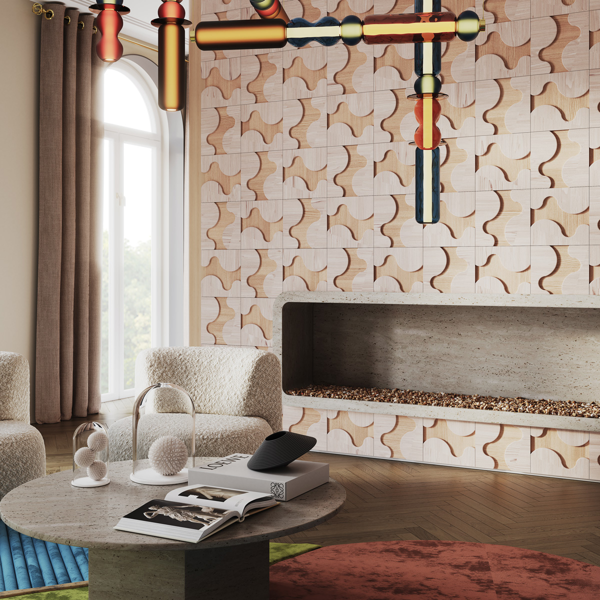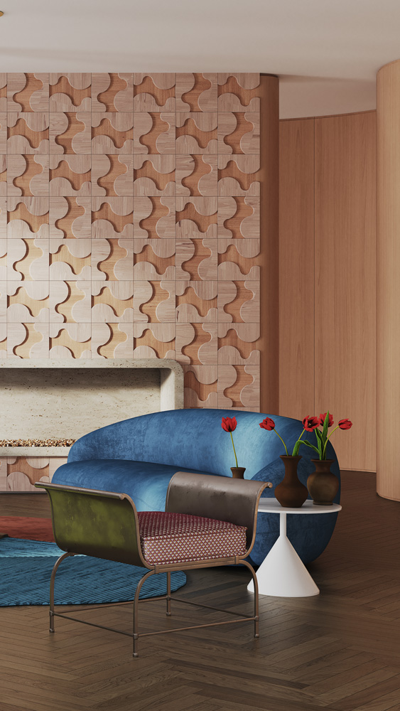 To revive Nuage in the interior, we invited the studio that most delicately feels the originality of Ukrainian architecture and creates real masterpieces - Sergey Makhno Architects. The architect suggested decorating the living room, bedroom and dining area with a panel, emphasizing the plasticity and versatility of the Nuage pattern.